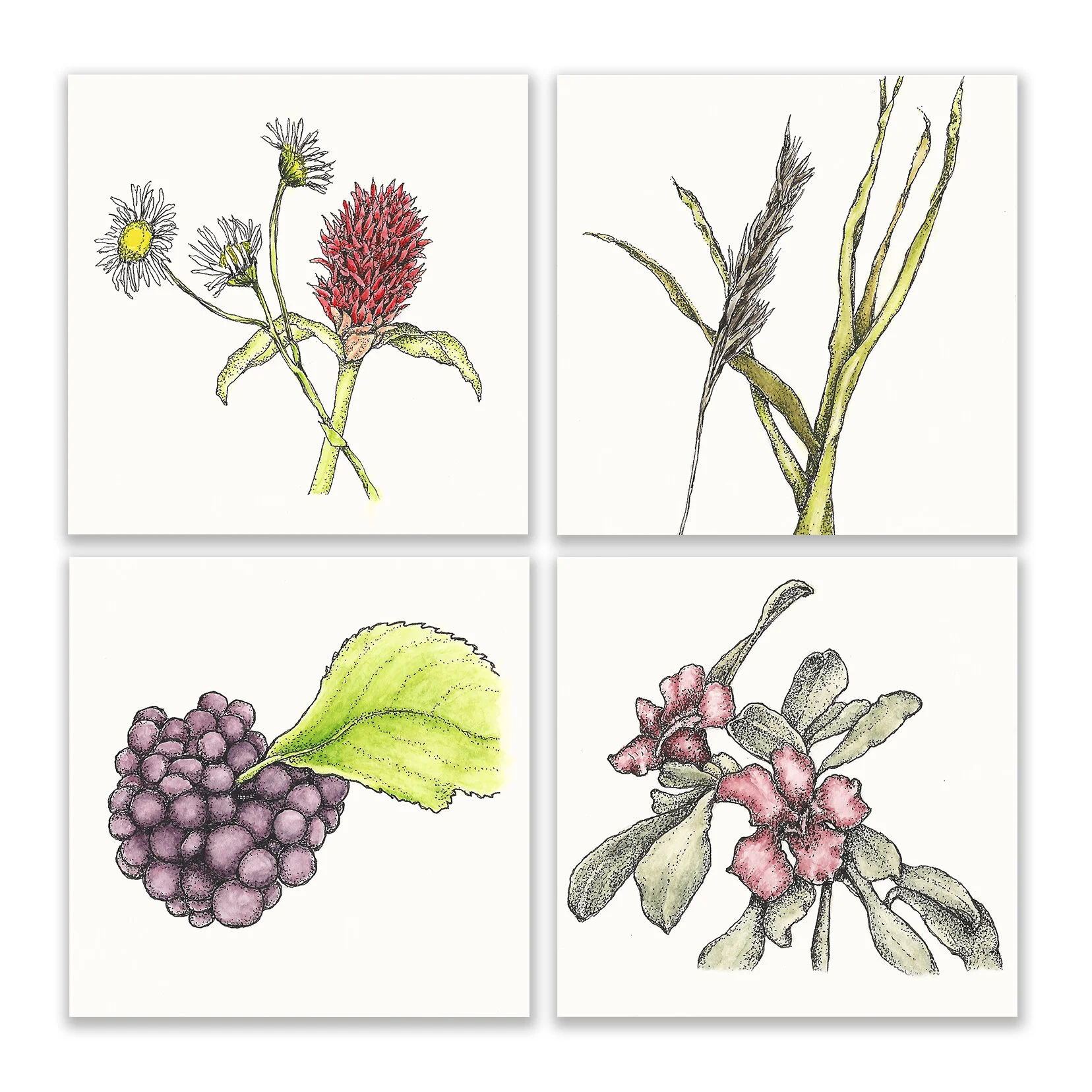 Late Summer, graphite, ink and watercolor on paper, 4 drawings, 3.625"w x 3.625"h each