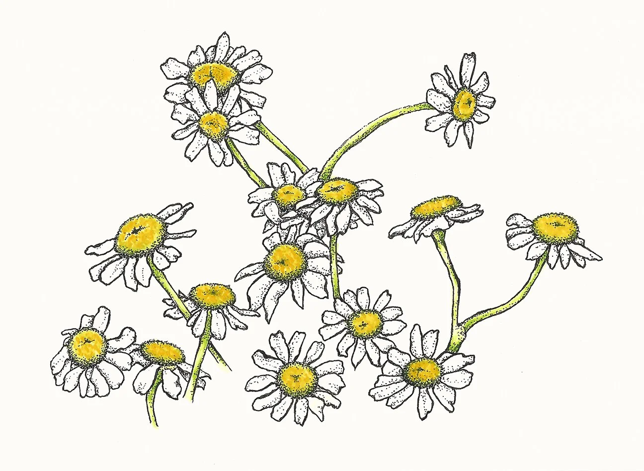 Chamomile, ink and watercolor on paper, 7"w x 5"h